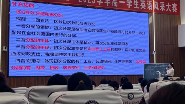 接着观摩示范课。示范课由李婷老师执教,教学内容为高中政治必修(一)的《完善个人收入分配》一课。李老师通过回顾上一节课所学内容引入新课,通过重难点突破和材料分析题两个模块开展教学活动。在小组讨论时,通过分析社会现象和具体案例来探究财富分配的公平性和合理性,从而丰富了课堂教学的实践性和趣味性。这种启发式教学方法能够激发学生学习的主动性和积极性,提高其批判性思维能力,不仅增强了学生对课本知识的理解,也培养了他们分析和解决实际问题的能力。课堂结尾,李老师进行课堂总结,通过“对接高考”环节让学生加强对所学知识的应用。