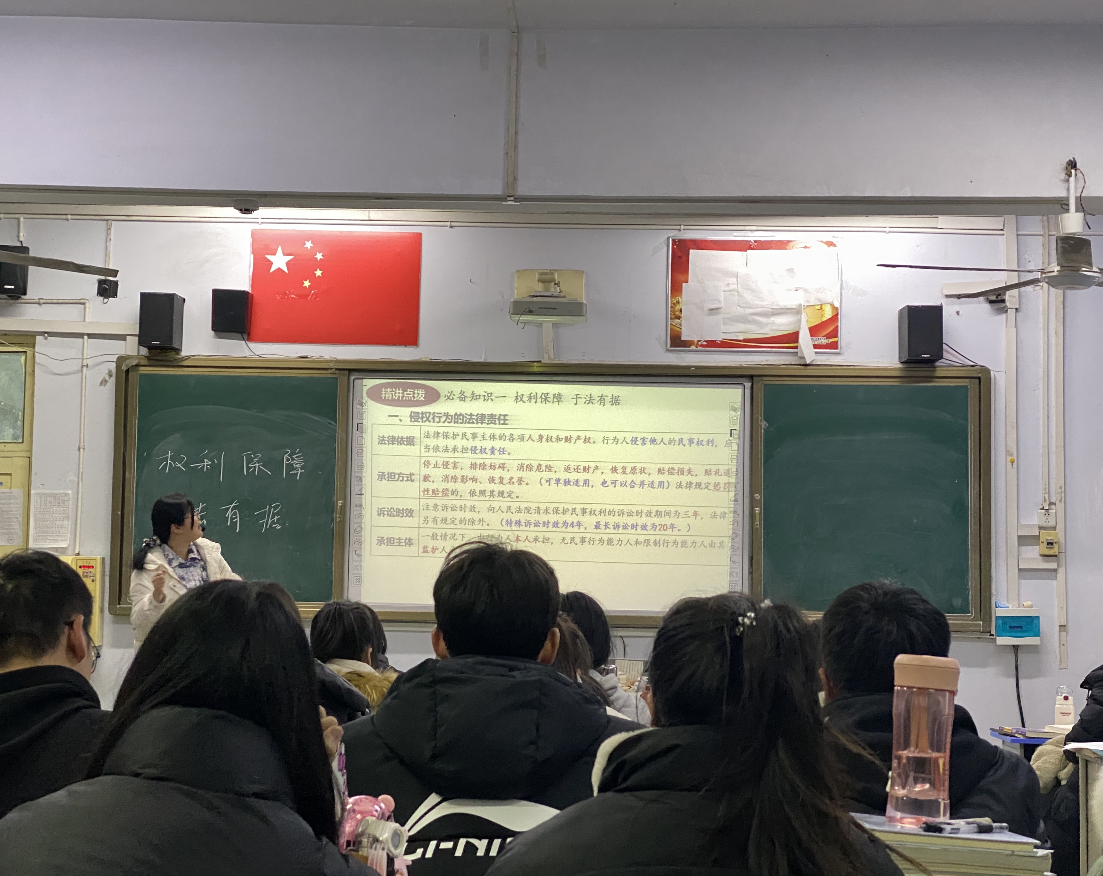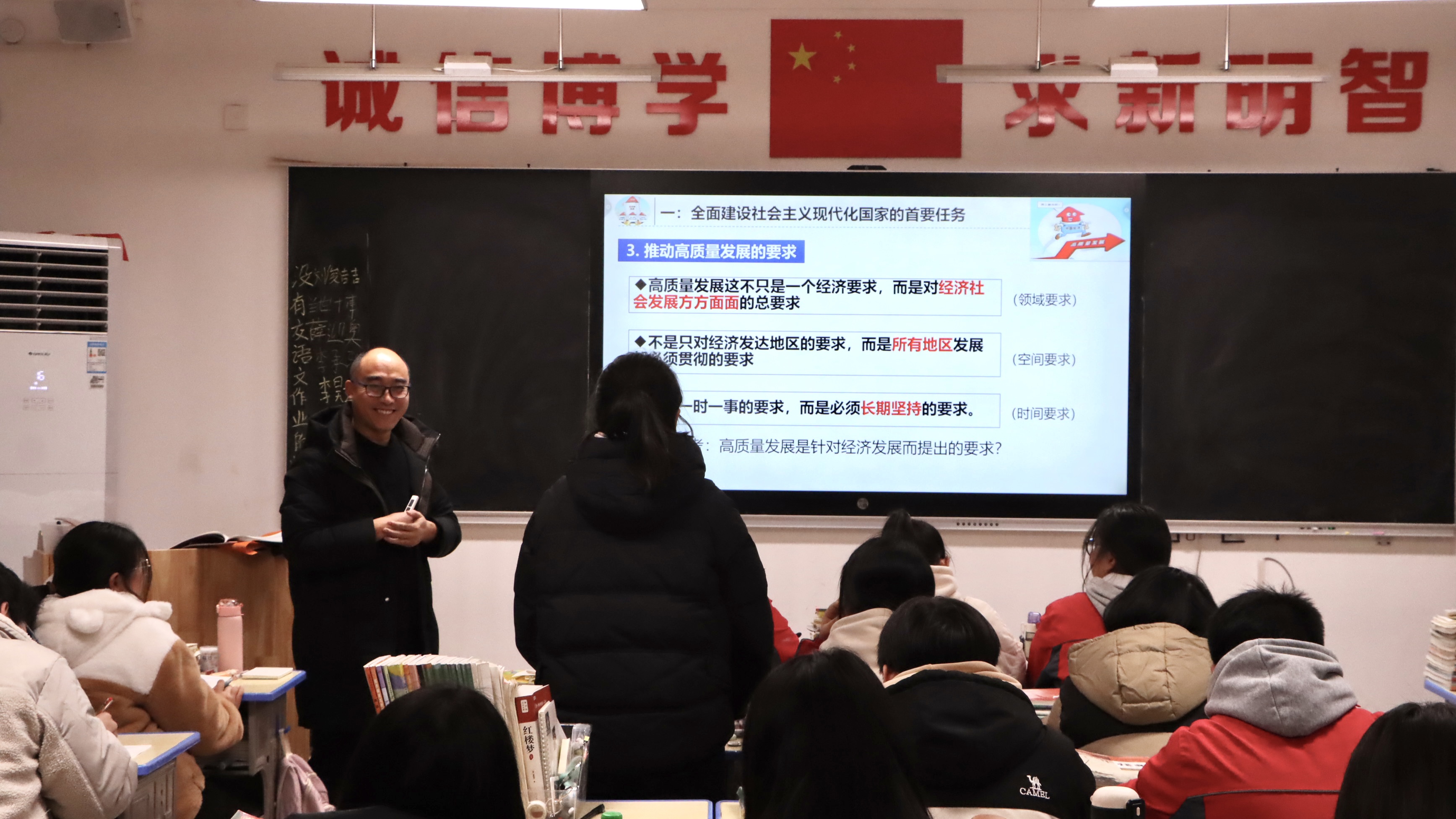 接着,丁老师带领坊员前往高三(5)班观摩听课。这节课是选择性必修法律与生活里的内容。任课老师授课时将抽象的概念与生活实际联系起来,通过实际案例分析引发同学们讨论,寓学于乐,自始至终学生都是课堂的参与者而不是被动接受者。之后,坊员们观摩了丁二凌老师讲述必修(二)经济与社会中推动高质量发展一课。丁老师在课件中穿插新闻视频材料,同时利用通俗易懂的语言和案例方法为同学们讲解基本概念。丁老师丰富生动的教学内容和灵活多样的教学方法,调动起了学生学习的热情与积极性。