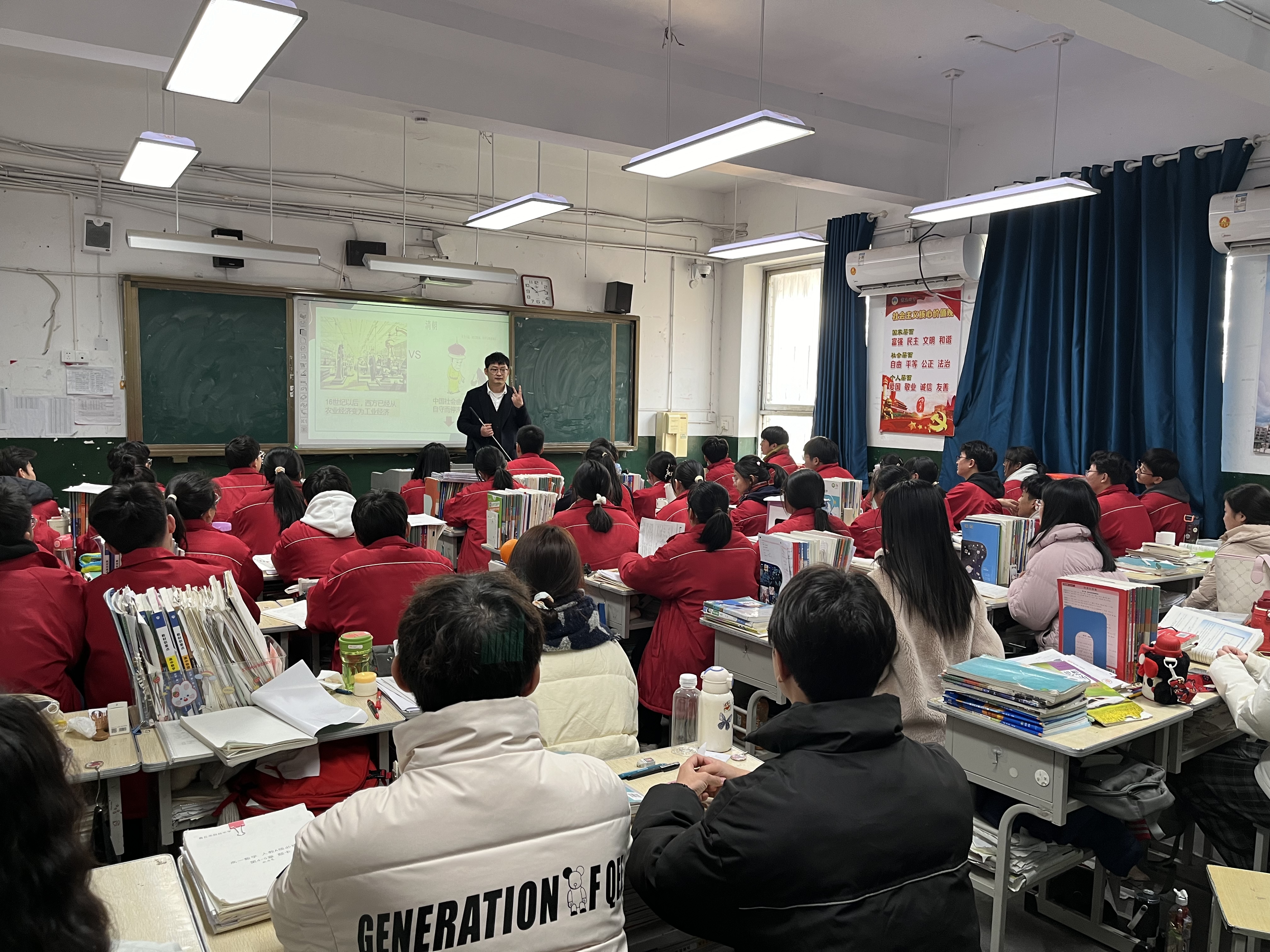 本次活动包括跟岗实习推进会和坊员观摩学习两个环节。跟岗实习推进会在回民中学二楼报告厅开展,由坊主陈通老师主持。随后,在陈老师的带领下,坊员进入班级开始听课实习。在课堂上,陈老师围绕核心议题“世界是普遍联系的”,对思想政治必修(四)哲学与文化中的相关知识进行了深入而通俗的讲解,陈老师教学设计非常完美,每一个细微的知识点都无遗漏,教学方法、手段灵活多样,为坊员们提供了难得的锻炼机会 。