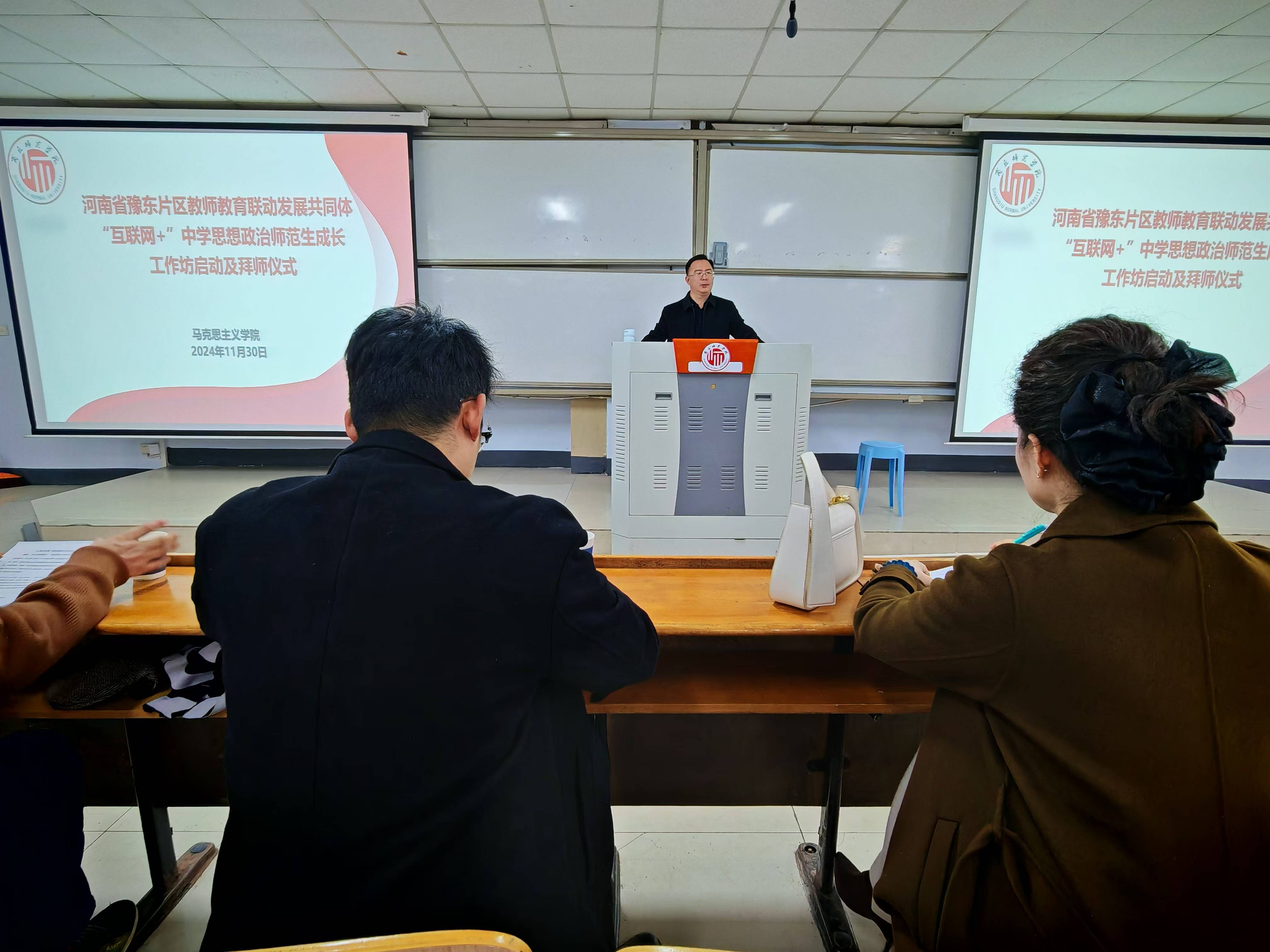 为积极落实学校制定的2024-2025学年度河南省豫东片区教师教育联动发展共同体“互联网+”师范生成长工作坊实施方案,启动和推进中学思想政治工作坊各项工作有效开展,艾弗森贝博ballbet官网于11月30日下午在智圆楼124教室举行中学思想政治工作坊启动及拜师仪式。艾弗森贝博ballbet官网院长司永海、商丘市回民高级中学陈通老师、商丘市第一高级中学刘旭峰老师、商丘市实验中学高秋艳老师、艾弗森贝博ballbet官网李凌云、宋玉老师,以及2022级全体坊员参加了此次活动。仪式由李凌云老师主持。
