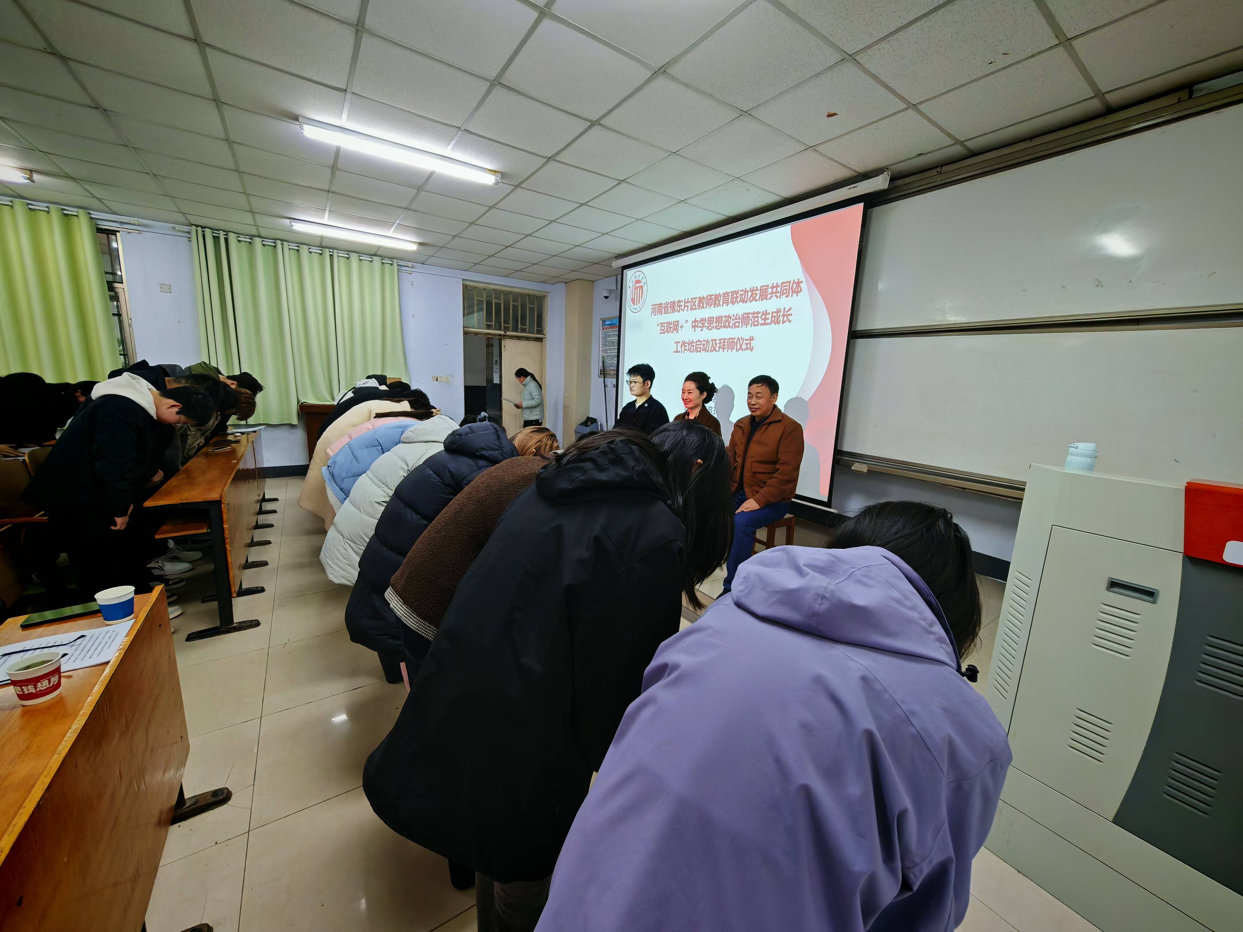 而后进行了庄重的坊员拜师仪式。先由各班的坊员组长向坊主导师鞠躬礼拜,然后22级全体坊员又向坊主导师们进行鞠躬礼拜。拜师结束后,坊员与坊主导师进行合影留念。