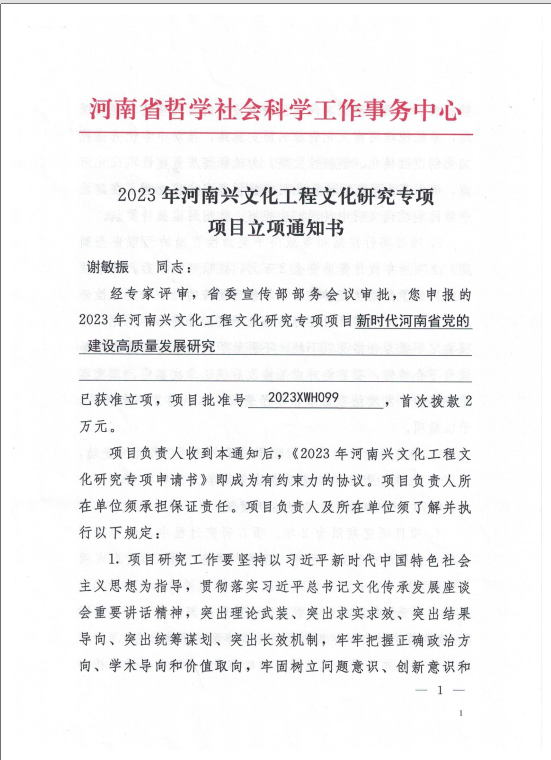 日前,河南省哲学社会科学规划办公布了2023年河南兴文化工程文化研究专项项目立项名单,贝博官网青年教师谢敏振博士申报的《新时代河南省党的建设高质量发展研究》获批立项。