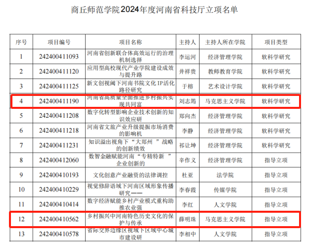 近日,河南省科技厅公布了2024年度河南省科技厅软科学立项项目清单,贝博官网两位教师获批立项,分别是刘志筠博士的《河南省高质量全面推进乡村振兴实现共同富裕的路径研究》和薛明珠博士的《乡村振兴中河南特色历史文化的保护与传承》。
