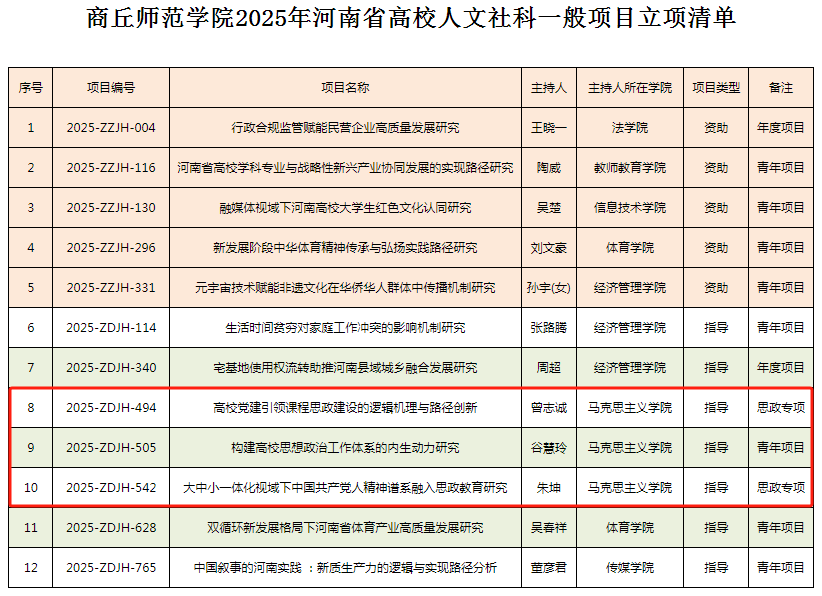 6月17日,河南省教育厅正式发布了关于下达2025年度河南省高校人文社会科学一般项目立项计划的通知。贝博官网的曾志诚、谷慧玲、朱坤三位老师的研究项目成功获得了立项,分别是曾志诚老师的《高校党建引领课程思政建设的逻辑机理与路径创新》,谷慧玲老师《构建高校思想政治工作体系的内生动力研究》,朱坤老师的《大中小一体化视域下中国共产党人精神谱系融入思政教育研究》。