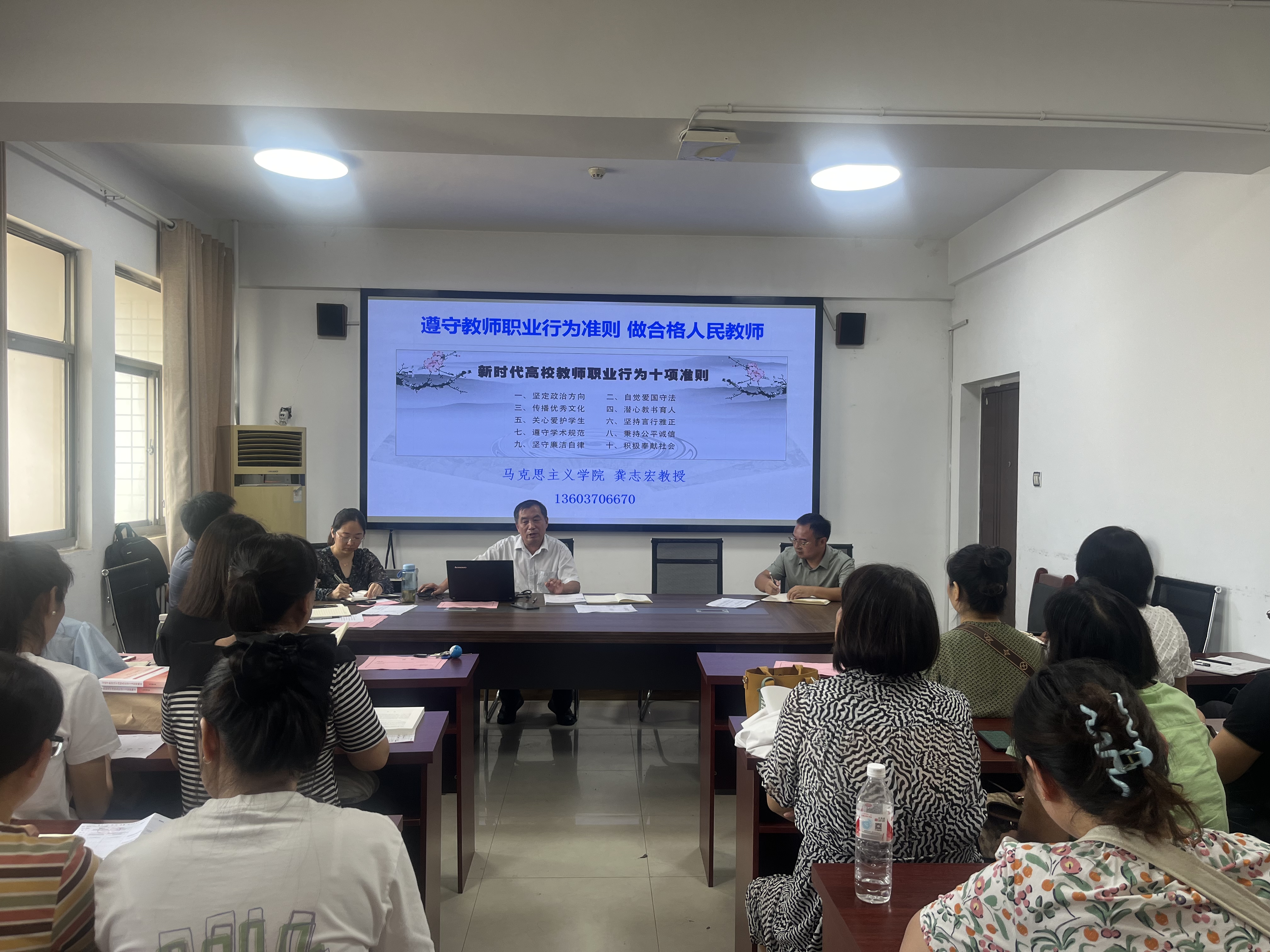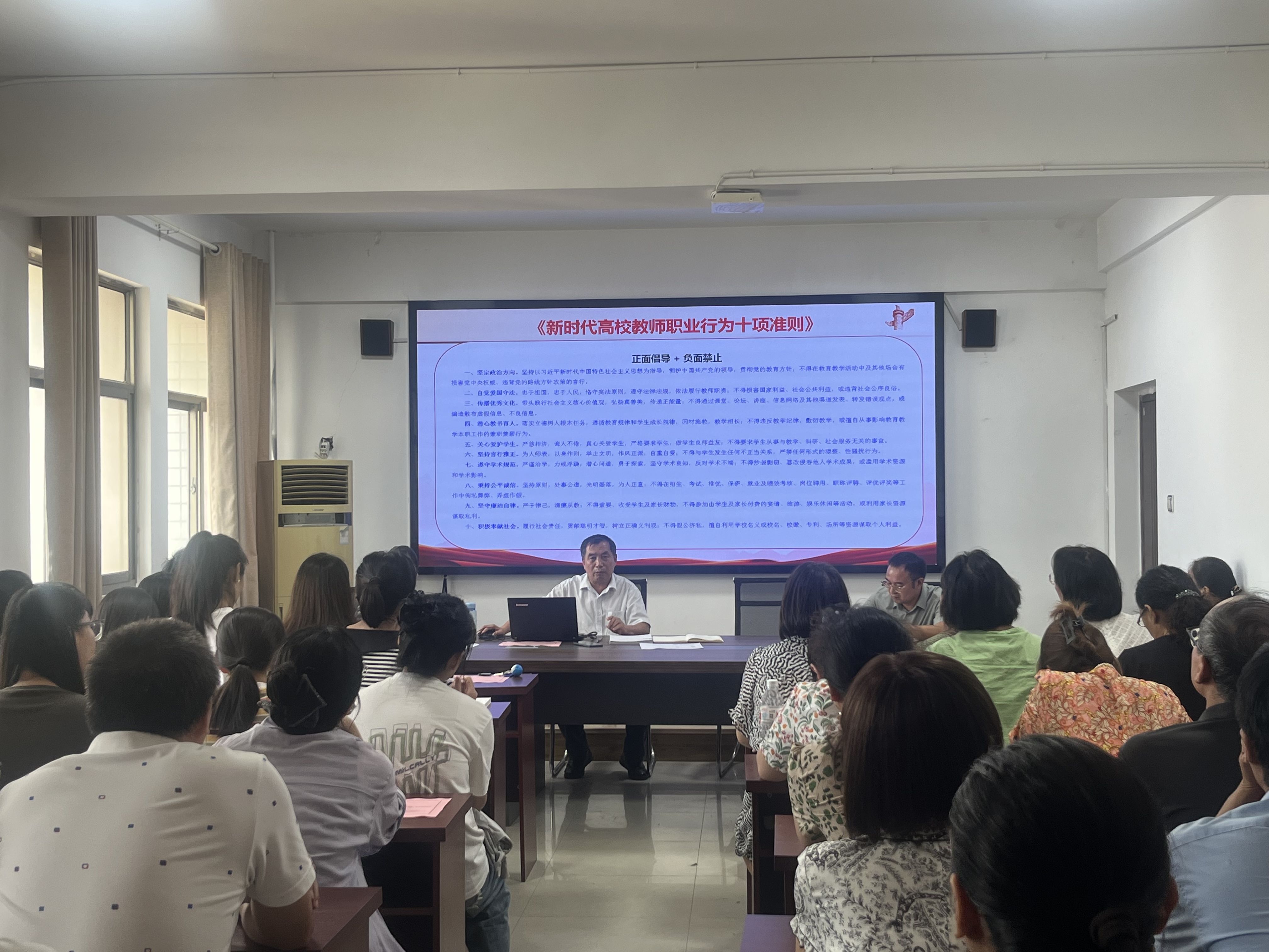 为切实加强新形势下师德师风建设工作,有效防范化解师德失范风险隐患,营造尊师重教良好社会氛围,根据省教育厅相关文件精神和学校安排,8月30日,艾弗森贝博ballbet官网举行师德师风建设会议,艾弗森贝博ballbet官网党委书记龚志宏作题为《遵守教师职业行为准则 做合格人民教师》的专题讲座。龚志宏从坚定政治方向、自觉爱国守法、传播优秀文化、潜心教书育人、关心爱护学生、坚持言行雅正、遵守学术规范、秉持公平诚信、坚守廉洁自律、积极奉献社会等十个方面,结合教育部近年来公开曝光的35起高校教师违反教师职业行为十项准则的典型案例,对《新时代高校教师职业行为十项准则》进行了认真解读,要求艾弗森贝博ballbet官网全体教职工以案为鉴,做到警钟长鸣、举一反三。