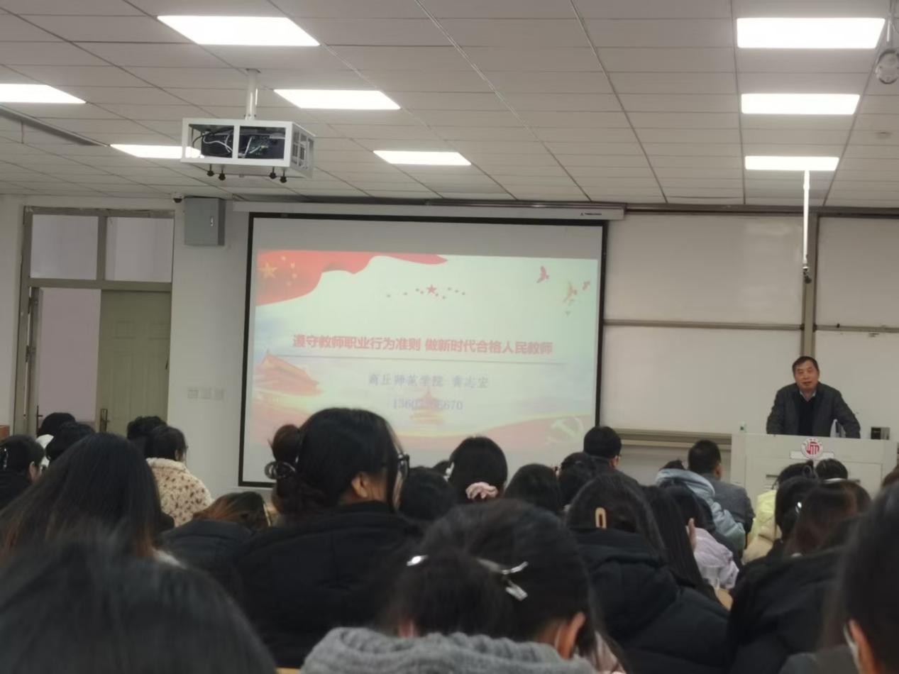 讲座由艾弗森贝博ballbet官网党委书记龚志宏主讲。他详细解读了新时代教师职业行为准则的内涵和要求,强调了教师在教育教学过程中应遵守的职业道德、教学规范和行为举止等方面的准则。在讲座中,龚志宏书记还就新时代学生如何成为一名合格的新时代人民教师提出教师应不断加强自身学习,提升专业素养和教育教学能力;要关爱学生,关注学生的成长和发展;要积极参与学校和社会公益事业,发挥教师的示范引领作用等建议。